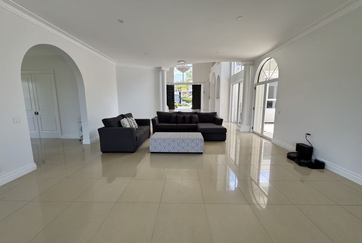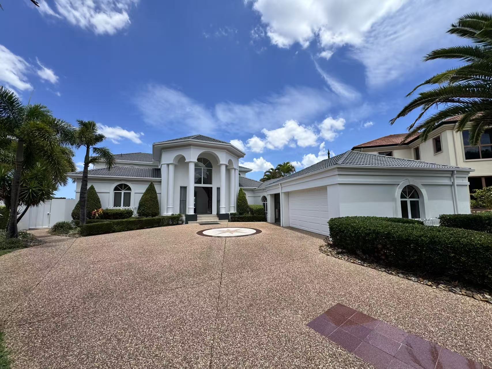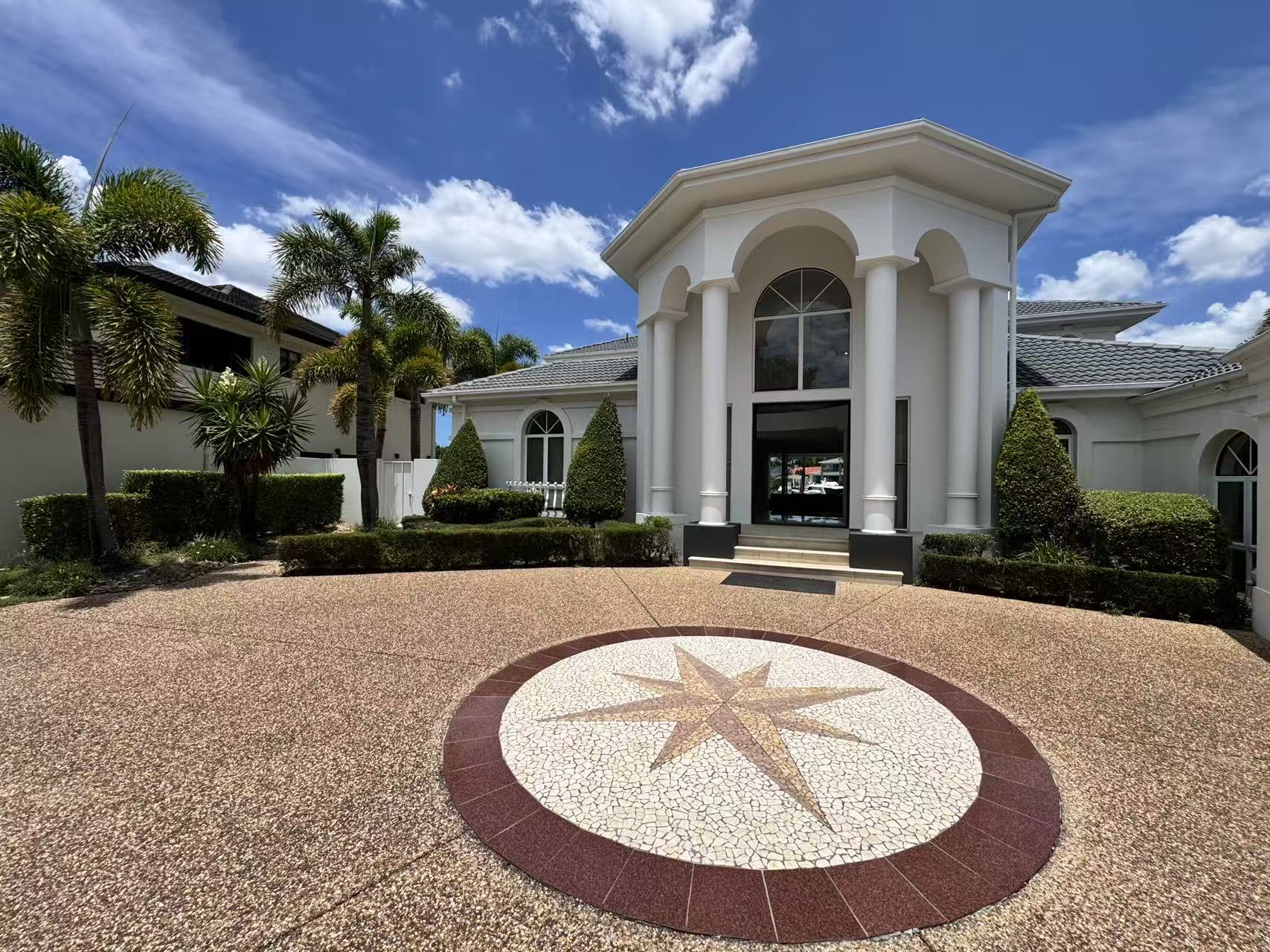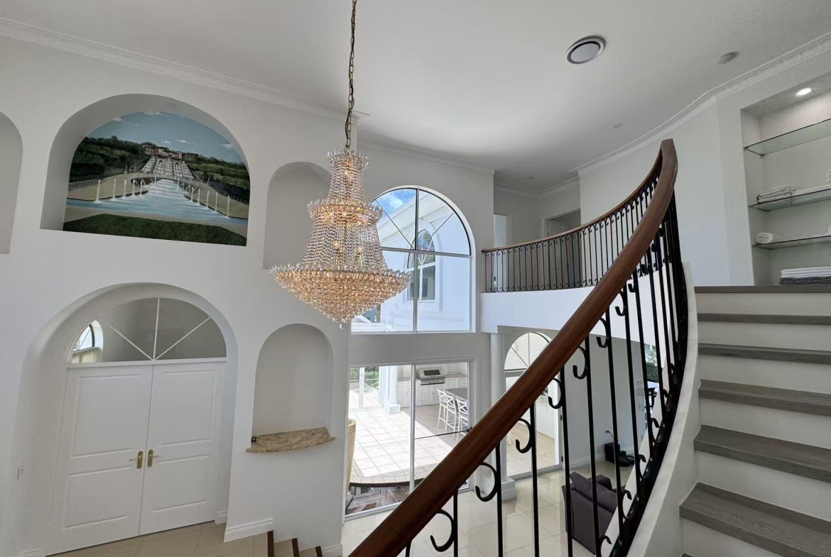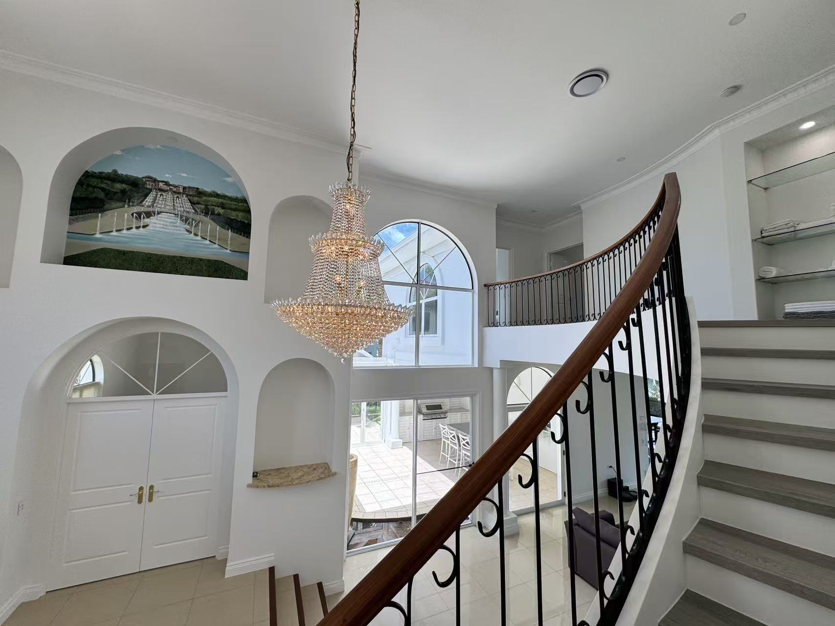 Approach via the sweeping driveway, a dramatic statement inlaid with an intricate mosaic tile pattern. The journey culminates at a majestic entry, where an exquisite grand crystal chandelier illuminates a curated mural painting, establishing a tone of gallery worthy sophistication. Inside, a seamless flow of polished marble and large format tiles reflects light, creating an atmosphere of cool, expansive elegance.
