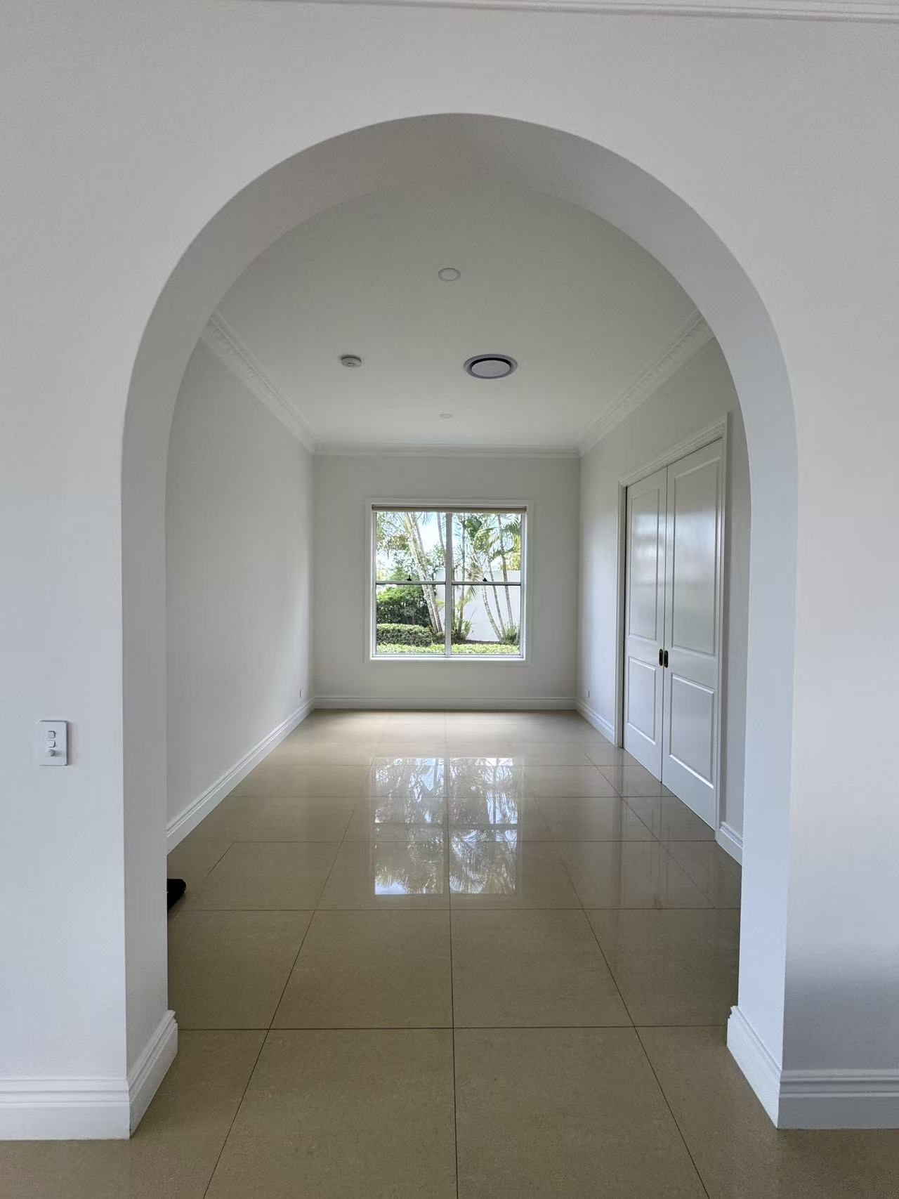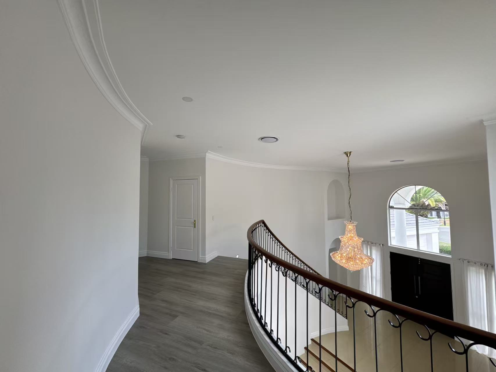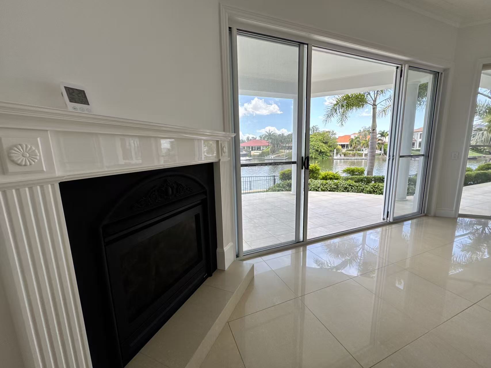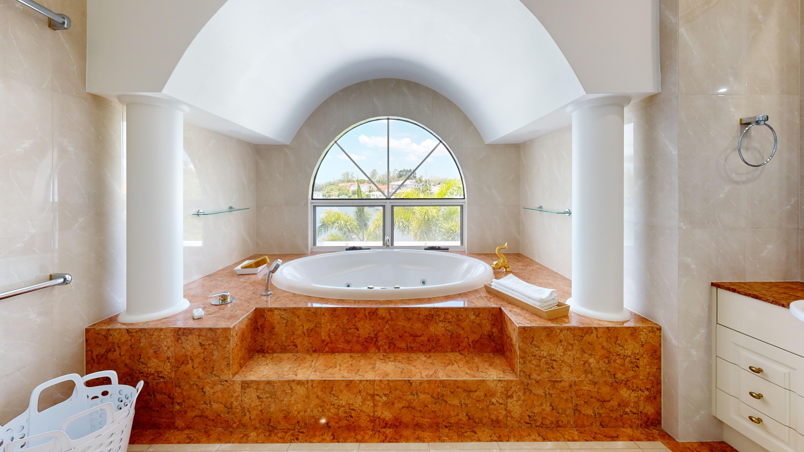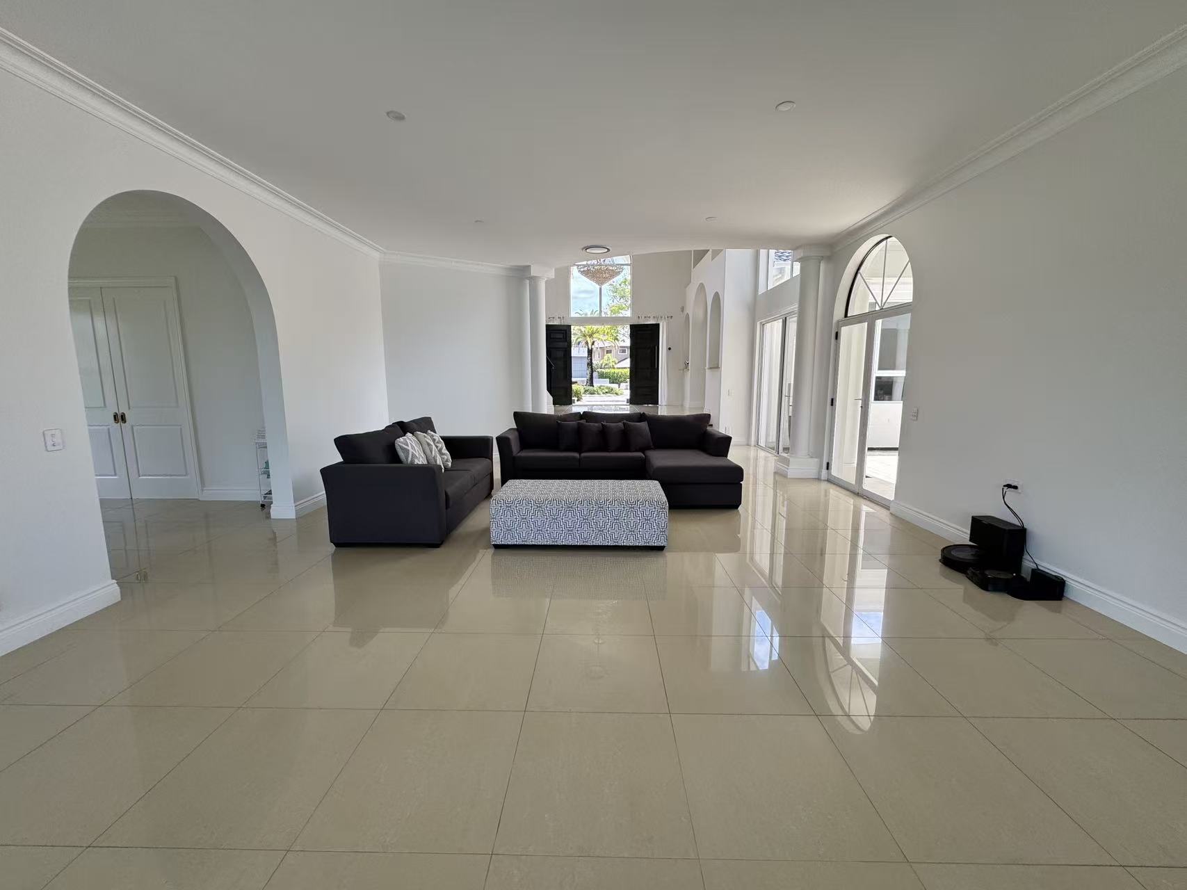 Approach via the sweeping driveway, a dramatic statement inlaid with an intricate mosaic tile pattern. The journey culminates at a majestic entry, where an exquisite grand crystal chandelier illuminates a curated mural painting, establishing a tone of gallery worthy sophistication. Inside, a seamless flow of polished marble and large format tiles reflects light, creating an atmosphere of cool, expansive elegance.